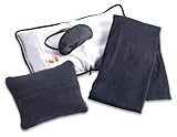 499 Features: -Indulge in soft comfort wherever you go with this compact set. -Five pieces includes: inflatable head pillow, fleece blanket, eye mask and one pair of foam ear plugs. -When deflated, the pillow converts to a compact carry case and includes a strap for attachment to luggage handles. -Available in black. -Inflated pillow dimensions: 18'' H x 3'' W x 11'' D. -Deflated pillow dimensions: 11.5'' H x 2.5 '' W x 9.5 '' D. -Blanket dimensions: 38'' W x 50'' D. California's Proposition 65 entitles California consumers to proper warnings for products that contain chemicals known to the state of California to cause cancer and birth defects, or other reproductive harm, if those products expose consumers to such chemicals above certain